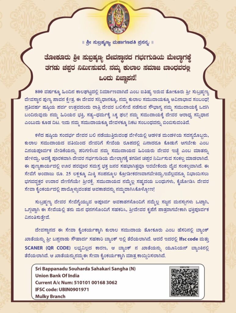 ಕಳೆದ ಷಷ್ಠಿಯ ಸಂದರ್ಭ ದೇವರ ಬಲಿ ನಡೆಯುತ್ತಿರುವಂಥ ವೇಳೆಯಲ್ಲಿ ಆಡಳಿತ ಮಂಡಳಿಯ ಸದಸ್ಯರೊಬ್ಬರು, ಕುಲಾಲ ಸಮುದಾಯದ ವತಿಯಿಂದ ದೇವರಿಗೆ ಸೇವೆಯ ರೂಪದಲ್ಲಿ ಏನಾದರೂ ಕೊಡುಗೆ ಆಗಬೇಕು ಎಂಬ ವಿನಯಪೂರ್ವಕ ಬೇಡಿಕೆಯನ್ನು ಪರಿಗಣಿಸಿದ ನಮ್ಮ ಸಮುದಾಯದ ಹಿರಿಯರು ದೇವರ ಇಚ್ಛೆ ಎಂಬ ಮಾತನ್ನು ಹೇಳಿದ್ದು, ಅದಕ್ಕೆ ಪೂರಕವಾಗಿ ದೇವರ ಗರ್ಭಗುಡಿಯ ಮೇಲ್ಬಾಗಕ್ಕೆ ತಗಡಿನ ಚಪ್ಪರ ನಿರ್ಮಿಸುವ ಸಂಕಲ್ಪ ಮಾಡಲಾಗಿದೆ. ಈ ಪುಣ್ಯಕಾರ್ಯದಲ್ಲಿ ಊರ ಪರವೂರ ಸಮಸ್ತ ಭಕ್ತ ಜನರ ಸಹಭಾಗಿತ್ವವೂ ಇರಬೇಕೆಂದು ದೈವ ಸಂಕಲ್ಪವಾಗಿದೆ. ಈ ಸೇವೆಗೆ ಅಂದಾಜು ರೂ. 25 ಲಕ್ಷಕ್ಕೂ ಮಿಕ್ಕಿ ಸಂಪನ್ಮೂಲ ಕ್ರೋಡೀಕರಣವಾಗಬೇಕಿದ್ದು. ಇವೆಲ್ಲವನ್ನೂ ನಿಭಾಯಿಸಲು ಭಗವದ್ಭಕ್ತರ ಉದಾರ ದೇಣಿಗೆಯೇ ಶ್ರೀರಕ್ಷೆಯಾಗಿದ್ದು ಸುಬ್ರಹ್ಮಣ್ಯ ದೇವರ ಸೇವೆಗೈಯ್ಯುವ ಅಪೂರ್ವ ಅವಕಾಶಗಳೊಂದಿಗೆ ನಮ್ಮೆಲ್ಲ ಸಜ್ಜನ ಮನಸ್ಸುಗಳು ಒಟ್ಟಾಗಿ, ಒಗ್ಗಟ್ಟಾಗಿ ಈ ಸೇವೆಯಲ್ಲಿ ತನು ಮನ ಧನಗಳೊಂದಿಗೆ ಸಹಕರಿಸಿ, ಶ್ರೀದೇವರ ಕೃಪೆಗೆ ಪಾತ್ರರಾಗಬೇಕಾಗಿ ವಿನಂತಿಸಲಾಗಿದೆ.