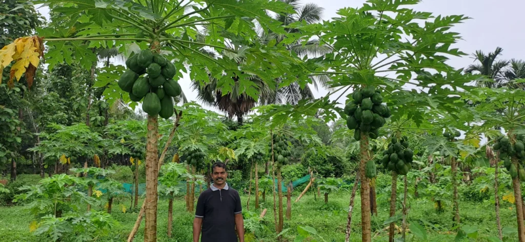 ಪಪ್ಪಾಯಿಯನ್ನು ೫-೬ ವರ್ಷಗಳಿಂದ ಬೆಳೆಯುತ್ತಾ ಬಂದಿದ್ದೇನೆ. ಮಳೆಗಾಲದಲ್ಲಿ ಪಪ್ಪಾಯಿ ಇಲ್ಲಿಯ ವಾತಾವರಣಕ್ಕೆ ಸ್ವಲ್ಪ ಕಷ್ಟ ಅಂತ ಹೇಳಬಹುದು. ಪಪ್ಪಾಯಿ ಗಿಡ ನೆಟ್ಟು ನಾಲ್ಕಾರು ತಿಂಗಳಲ್ಲೇ ಕಾಯಿ ಬಿಡುತ್ತದೆ. ಈ ಕಾಯಿಗಳು ಬೆಳೆಯಲು ಮೂರ್ನಾಲ್ಕು ತಿಂಗಳು ಬೇಕಾಗುತ್ತದೆ. ನಂತರ ಪ್ರತೀ ವಾರ ನಿರಂತರವಾಗಿ ಕಾಯಿಗಳು ಲಭಿಸುತ್ತಾ ಹೋಗುತ್ತದೆ. ಮಳೆಗಾಲದಲ್ಲಿ ಕೆಲವೊಮ್ಮೆ ಗಾಳಿಗೆ ಗಿಡಗಳು ತುಂಡಾಗಿ ಬೀಳುತ್ತವೆ. ಆದರೂ ಇದು ಲಾಭದಾಯಕ ಕೃಷಿ. ಈ ಬಾರಿ ಎಪ್ರಿಲ್ನಲ್ಲಿ ದೊಡ್ಡ ಗಾಳಿ ಬಂದಾಗ ಒಂದಷ್ಟು ಗಿಡಗಳು ತುಂಡಾಗಿ ಹೋಗಿವೆ. ತುಂಡಾದ ಸ್ಥಳದಿಂದಲೇ ಮತ್ತೆ ಅದು ಬೆಳೆಯುವುದರಿಂದ ತುಂಡಾದ ಗಿಡಗಳನ್ನು ಕಿತ್ತು ಬಿಸಾಡಬೇಕಾದ ಅನಿವಾರ್ಯತೆ ಇಲ್ಲ. ನಾವು ಯಾವುದೇ ರಾಸಾಯನಿಕ ಪದಾರ್ಥ ಬಳಸದೇ ಇರುವುದರಿಂದ ಊರಿನ ಪಪ್ಪಾಯಿ ಹಣ್ಣುಗಳನ್ನು ಜನರು ಖರೀದಿಸುತ್ತಾರೆ. ನಾನು ಸುಮಾರು ೨೦೦ ಪಪ್ಪಾಯಿ ಗಿಡಗಳನ್ನು ಬೆಳೆಸಿದ್ದು ನನಗೆ ಇದರಿಂದ ಲಾಭ ತಂದಿದೆ ಹೊರತು ನಷ್ಟವಾಗಿಲ್ಲ