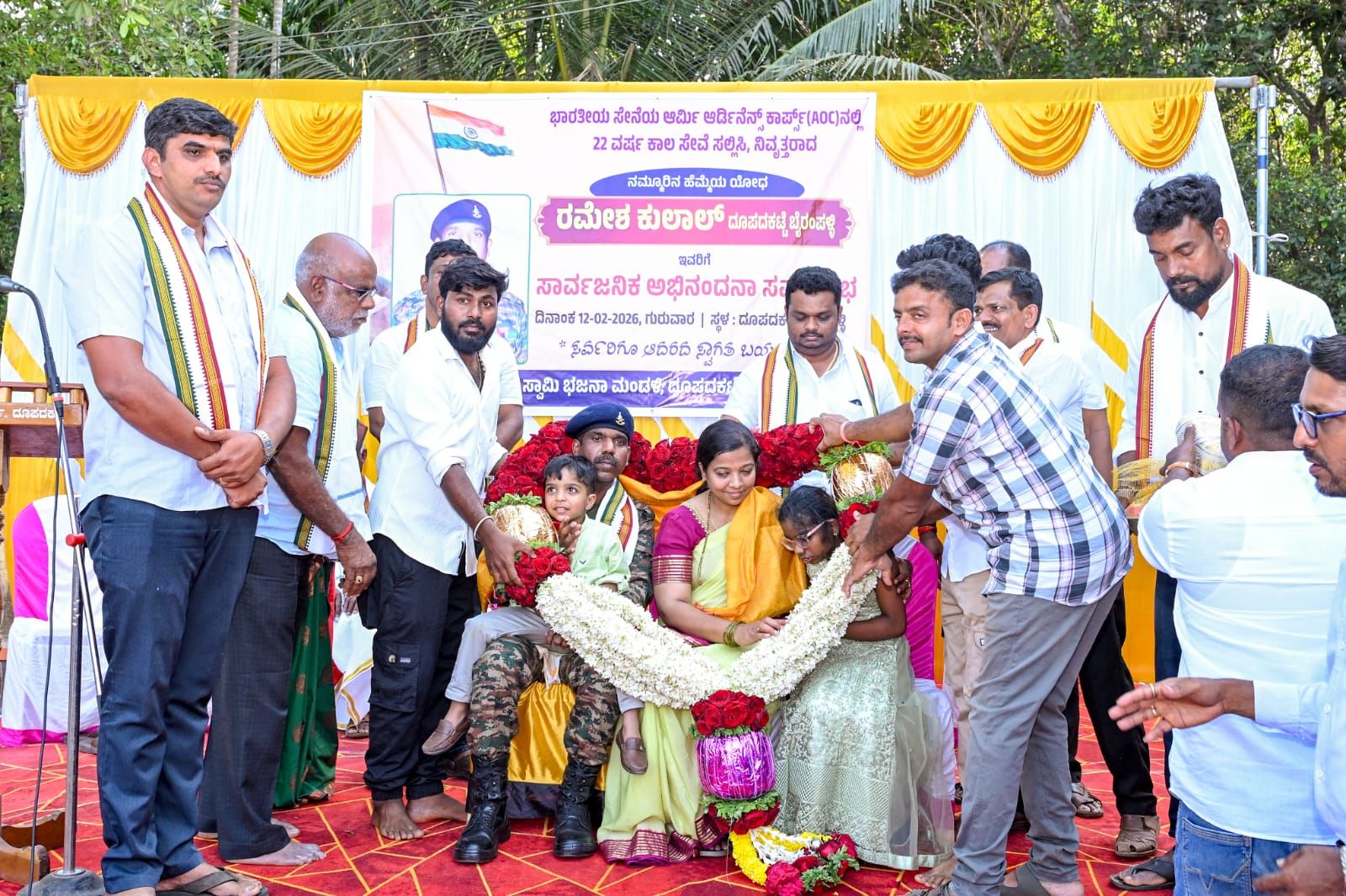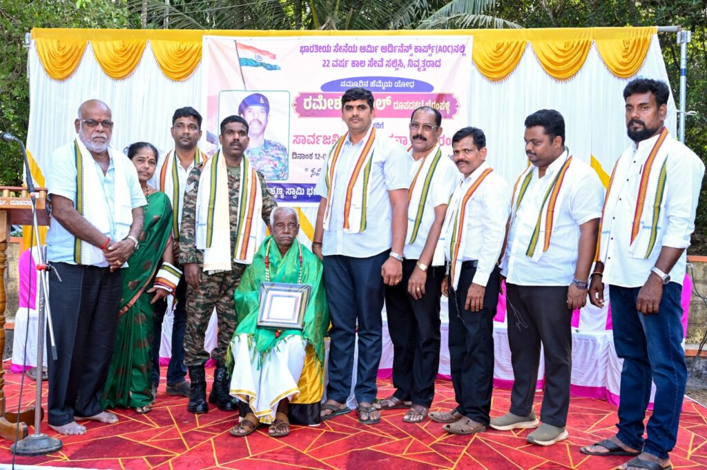 ಪೆರ್ಡೂರು(ಕುಲಾಲ ವರ್ಲ್ಡ್ ಡಾಟ್ ಕಾಮ್) : ದೂಪದಕಟ್ಟೆ ಬೈರಂಪಳ್ಳಿಯ ನಿವಾಸಿ, ಭಾರತೀಯ ಸೇನೆಯ ಆರ್ಮಿ ಆರ್ಡಿನೆನ್ಸ್ ಕಾರ್ಪ್ಸ್ ತರಬೇತಿ ಕೇಂದ್ರದಲ್ಲಿ ಸುದೀರ್ಘ ವರ್ಷದ ಸೇವೆ ಮಾಡಿ ನಿವೃತ್ತಿ ಹೊಂದಿದ ಯೋಧ ರಮೇಶ್ ಕುಲಾಲರಿಗೆ ಹುಟ್ಟೂರ ಅಭಿನಂದನಾ ಕಾರ್ಯಕ್ರಮವು ಶ್ರೀ ವಾಸುಕಿ ಸುಬ್ರಹ್ಮಣ್ಯ ಸ್ವಾಮಿ ಭಜನಾ ಮಂಡಳಿ, ದೂಪದ ಕಟ್ಟೆ ಪೆರ್ಡೂರು ಮುಂದಾಳತ್ವದಲ್ಲಿ ಗ್ರಾಮಸ್ಥರ ಉಪಸ್ಥಿತಿಯಲ್ಲಿ, ರಮೇಶ್ ಕುಲಾಲರ ಅಭಿಮಾನಿ ಬಳಗದಿಂದ ಭವ್ಯ ಮೆರವಣಿಗೆಯಲ್ಲಿ ಸಾಗಿ ಬಂದು ಪೆರ್ಡೂರು ದೂಪದ ಕಟ್ಟೆ ಬೈರಂಪಳ್ಳಿಯಲ್ಲಿ ಗುರುವಾರ ಜರಗಿತು.