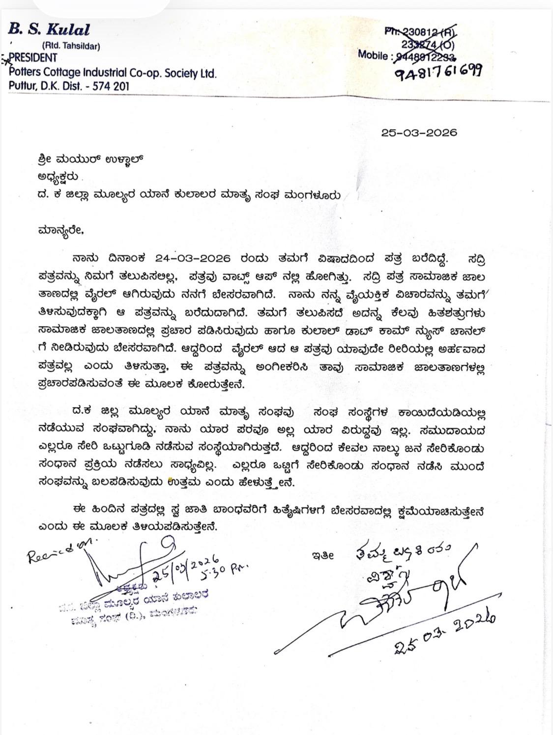 ವೈರಲ್ ಪತ್ರದ ಕುರಿತು ಬಿ.ಎಸ್ ಕುಲಾಲ್ ಸ್ಪಷ್ಟನೆ