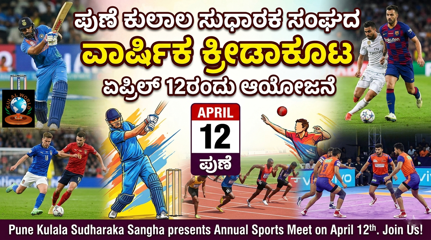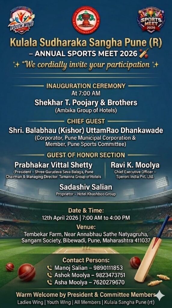 ಪುಣೆ(ಕುಲಾಲ ವರ್ಲ್ಡ್ ಡಾಟ್ ಕಾಮ್) : ಇಲ್ಲಿನ ಕುಲಾಲ ಸುಧಾರಕ ಸಂಘ (ರಿ), ಪುಣೆ ಇದರ ವತಿಯಿಂದ 2026ರ ವಾರ್ಷಿಕ ಕ್ರೀಡಾಕೂಟವು ಏಪ್ರಿಲ್ 12ರಂದು ಬಿಬೆವಾಡಿಯ ತೆಂಬೆಕರ್ ಫಾರ್ಮ್ನಲ್ಲಿ ಬಹಳ ವಿಜೃಂಭಣೆಯಿಂದ ನಡೆಯಲಿದೆ. ಸಮುದಾಯದ ಬಾಂಧವರಲ್ಲಿ ಕ್ರೀಡಾ ಮನೋಭಾವ ಮತ್ತು ಒಗ್ಗಟ್ಟನ್ನು ಮೂಡಿಸುವ ಉದ್ದೇಶದಿಂದ ಈ ಕಾರ್ಯಕ್ರಮವನ್ನು ಹಮ್ಮಿಕೊಳ್ಳಲಾಗಿದೆ.