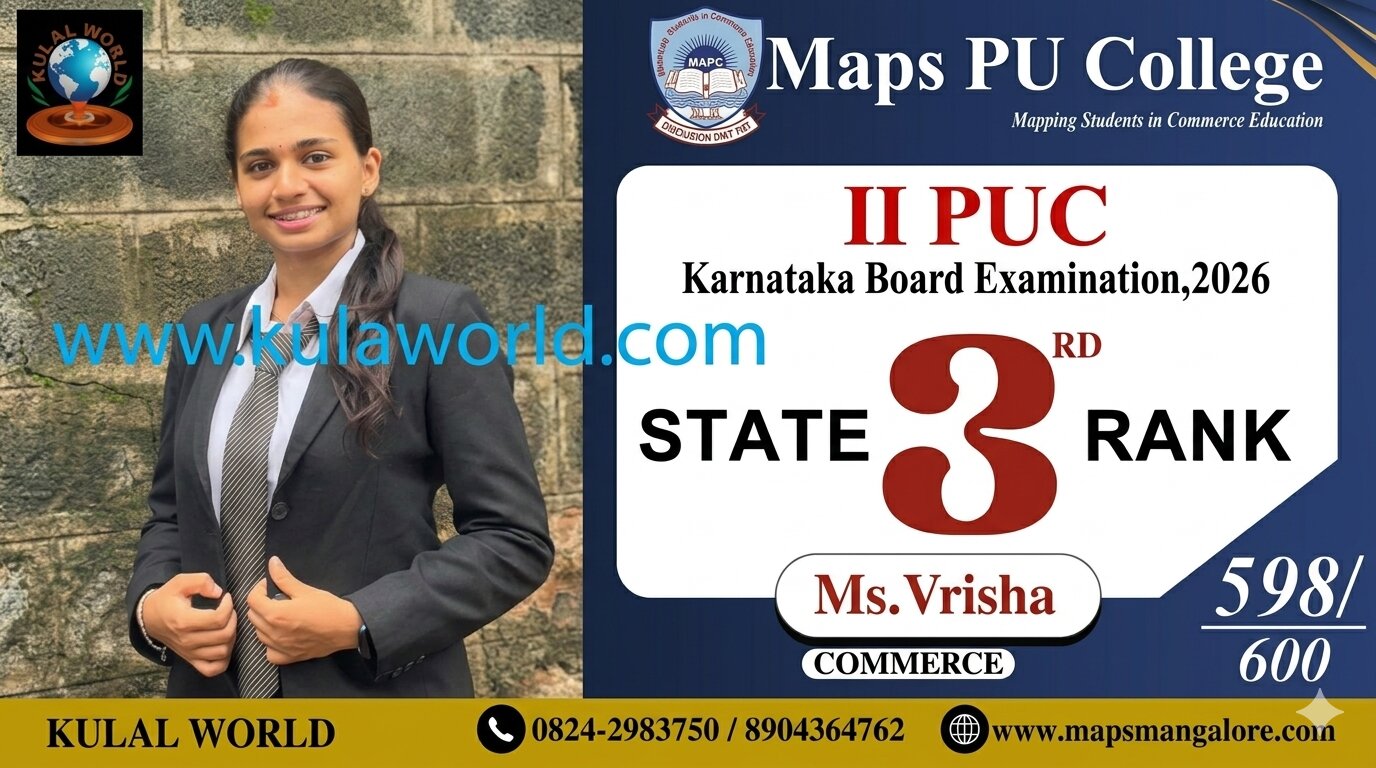 ಮಂಗಳೂರು(ಕುಲಾಲ ವರ್ಲ್ಡ್ ಡಾಟ್ ಕಾಮ್): ಮಂಗಳೂರಿನ MAPS (ಮಂಗಳೂರು ಅಕಾಡೆಮಿ ಆಫ್ ಪ್ರೊಫೆಷನಲ್ ಸ್ಟಡೀಸ್) ಕಾಲೇಜಿನ ವಿದ್ಯಾರ್ಥಿನಿ ವ್ರಶಾ, 2025-26ನೇ ಸಾಲಿನ ದ್ವಿತೀಯ ಪಿಯುಸಿ ಪರೀಕ್ಷೆಯಲ್ಲಿ ಅಭೂತಪೂರ್ವ ಸಾಧನೆ ಮಾಡುವ ಮೂಲಕ ಕರಾವಳಿಯ ಕೀರ್ತಿ ಪತಾಕೆಯನ್ನು ರಾಜ್ಯಮಟ್ಟದಲ್ಲಿ ಹಾರಿಸಿದ್ದಾರೆ.